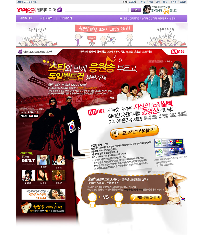 <¹®È­´º½º> 2006 FIFA µ¶ÀÏ ¿ùµåÄÅÀÌ 90¿©ÀÏ ³²Àº °¡¿îµ¥ ¿ùµåÄÅ °ø½Ä ÈÄ¿ø ¾÷üµéÀÌ ÀÎÅͳÝÀ» ÅëÇÑ ¿ùµåÄŠƼÄÏ ¸¶ÄÉÆÃÀ» º»°ÝÀûÀ¸·Î ½ÃÀÛÇß´Ù. ƯÈ÷, Áö³­ 1¿ù ÀÎÅÍ³Ý Ãß÷À» ÅëÇØ ÆÇ¸ÅÇÑ ÀÏ¹Ý ÆÇ¸Å¿ë ¿ùµåÄÅ °ü¶÷±Ç 3000ÀåÀº ¿ÏÀü ¸ÅÁøµÇ¸é¼­, ÀϹÝÀÎÀÌ °ø½ÄÀûÀ¸·Î ¿ùµåÄŠƼÄÏÀ» ±¸¸ÅÇÏ´Â °ÍÀÌ ºÒ°¡´ÉÇÑ »óȲÀÌ´Ù. ÀÌ ¶§¹®¿¡ ³×ƼÁðµéÀº ¿ùµåÄÅ °ø½Ä ÈÄ¿ø ¾÷üµéÀÌ ´Ù¾çÇÑ ¿Â¶óÀÎ À̺¥Æ®¸¦ ÅëÇØ ¿ùµåÄŠƼÄÏÀ» Á¦°øÇÏ´Â ÇÁ·Î¸ð¼Ç¿¡ Å« ±â´ë¸¦ °É°í ÀÖ´Ù. °ø½Ä ½ºÆù¼­ ÀÌ¿ÜÀÇ ¾÷ü°¡ ¿ùµåÄŠƼÄÏÀ» ¸¶ÄÉÆÃ °æÇ°À¸·Î °Å´Â °ÍÀº FIFAÀÇ °­·ÂÇÑ Á¦Àç ´ë»óÀÌ µÇ¹Ç·Î ƯÈ÷ °ø½Ä ½ºÆù¼­ ¾÷üµéÀÇ ¿ùµåÄÅ À̺¥Æ®µéÀº ´õ¿í ´«±æÀ» ²ø°í ÀÖ´Ù. ¾ßÈÄ!ÄÚ¸®¾Æ(www.yahoo.co.kr, ´ëÇ¥ ¼º³«¾ç)´Â Çѱ¹ ±¹°¡ ´ëÇ¥ÆÀÀÇ ¼±ÀüÀ» ±â¿øÇÏ´Â '¿ùµåÄÅ ÆóÀÎ 320' Ä·ÆäÀÎÀ» ÁøÇà ÁßÀÌ´Ù. ¾ßÈÄ!´Â ¿Â¶óÀÎ ±â¾÷ °¡¿îµ¥ À¯ÀÏÇÏ°Ô FIFA µ¶ÀÏ ¿ùµåÄÅ °ø½Ä ÆÄÆ®³ÊÀÎ ¾ßÈÄ!ÀÇ °­Á¡À» ÃÖ´ëÇÑ »ì·Á '¿ùµåÄÅ ÆóÀÎ' 320¸í¿¡°Ô ÇöÁö¿¡¼­ ¿ùµåÄÅ º»¼± Çѱ¹Àü °æ±â¸¦ °ü¶÷ÇÒ ¼ö ÀÖ´Â ÀÔÀå±Ç 320ÀåÀ» Á¦°øÇÒ ¿¹Á¤ÀÌ´Ù. À̸¦ À§ÇØ, ¾ßÈÄ!ÄÚ¸®¾Æ´Â Åä°í, ÇÁ¶û½º, ½ºÀ§½º¿Í ´ëÇ×ÇÏ´Â Çѱ¹Àü ƼÄÏ 320Àå»Ó¸¸ ¾Æ´Ï¶ó, ÇØ´ç °æ±â °ü¶÷À» À§ÇÑ È£ÅÚ ¼÷¹Ú, ¿Õº¹ Ç×°øÆíÀ» Æ÷ÇÔÇÑ 160°³ÀÇ(1ÀÎ 2°æ±â °ü¶÷) '¿ùµåÄÅ ÆÐŰÁö'¸¦ ±¸¼ºÇß´Ù. '¿ùµåÄÅ ÆóÀÎ 320' Ä·ÆäÀÎÀÇ Ã¹ ½ºÅ¸Æ®·Î ¾ßÈÄ!ÄÚ¸®¾Æ´Â Mnet°ú °øµ¿À¸·Î ÁøÇàÇÏ´Â ¿ùµåÄÅ ÀÀ¿ø¼Û ÇÁ·ÎÁ§Æ®¿Í ÃÖ±Ù Æø¹ßÀûÀÎ Àαâ¸ôÀ̸¦ Çϰí ÀÖ´Â KBS 'ÇØÇǼ±µ¥ÀÌ'ÀÇ FC½¸µ¹ÀÌÀÇ °ø½Ä ºí·Î±× ¿ÀÇÂÀ» ±â³äÇÏ´Â ÇÁ·Î¸ð¼Ç À̺¥Æ®¸¦ ÁøÇàÇÑ´Ù°í 9ÀÏ ¹àÇû´Ù. ¾ßÈÄ!ÄÚ¸®¾Æ¿Í MnetÀÌ ÇÔ²²ÇÏ´Â ¿ùµåÄÅ ÀÀ¿ø¼Û ÇÁ·ÎÁ§Æ®´Â ¸ÖƼ¹Ìµð¾î ¼­ºñ½º ¾ß¹Ì¸¦ ÅëÇØ ³¢ ¸¹Àº ³×ƼÁðµéÀÇ Àû±ØÀûÀÎ Âü¿©¸¦ À¯µµÇÏ¿© 2002³âÀÇ '¿À Çʽ ÄÚ¸®¾Æ!' ¸øÁö ¾ÊÀº ½Å³ª´Â ÀÀ¿ø¼ÛÀ» ½ºÅ¸µé°ú Á÷Á¢ ³ìÀ½ÇÒ ¼ö ÀÖ´Â ±âȸ¸¦ Á¦°øÇÑ´Ù. ³×ƼÁðµéÀÌ '¿À Çʽ ÄÚ¸®¾Æ!'¿Í °°Àº ÀÀ¿ø°¡¸¦ ºÎ¸£´Â ¸ð½ÀÀ̳ª µ¶Ã¢ÀûÀÎ ÀÀ¿ø ¸ð½ÀÀ» µ¿¿µ»óÀ¸·Î Âï¾î ¾ßÈÄ!ÄÚ¸®¾Æ¿¡ ¿Ã¸®¸é ¿¹¼±°ú º»¼±À» °ÅÃÄ Å¬·Ð, 俬, SS501, ÄÚ¿äÅ×, NRG µî Àα⠽ºÅ¸µé°ú ¿ùµåÄÅ ÀÀ¿ø¼ÛÀ» ºÎ¸¦ '¾ß¹Ì ½ºÅ¸'·Î ¼±¹ßµÈ´Ù. ÀÀ¿ø¼Û ÇÁ·ÎÁ§Æ®ÀÇ ¿¹¼±°ú º»¼±Àº ¸ðµÎ ³×ƼÁðµéÀÇ ÅõÇ¥·Î ÁøÇàµÇ¸ç, ¿¹¼± Âü¿©ÀÚ °¡¿îµ¥ ÃÑ 10¸íÀÌ º»¼±¿¡ ÁøÃâÇÏ°Ô µÈ´Ù. ¾ßÈÄ!ÄÚ¸®¾Æ´Â º»¼± ÁøÃâÀÚ 10¸í °¡¿îµ¥ 1µî 2¸í¿¡°Ô ½ºÅ¸µé¿Í ÇÔ²² ¿ùµåÄÅ ÀÀ¿ø¼ÛÀ» ³ìÀ½ÇÏ°í ¹ÂÁ÷ºñµð¿À¿¡ ÇÔ²² Ã⿬ÇÒ ¼ö ÀÖ´Â ±âȸ¿Í ÇÔ²² ¾ßÈÄ!µ¶ÀÏ ¿ùµåÄÅ ÆÐŰÁö(Çѱ¹ ´ëÇ¥ÆÀ °æ±â 2°ÔÀÓ °ü¶÷ ¹× Ç×°ø, ¼÷¹Ú Á¦°ø)¸¦ Á¦°øÇÑ´Ù. 2µî 2¸í ¿ª½Ã ¾ßÈÄ!µ¶ÀÏ ¿ùµåÄÅ ÆÐŰÁö°¡ ºÎ¿©µÇ¸ç ³ª¸ÓÁö º»¼± Âü°¡Àڵ鿡°Ô´Â Çѱ¹ ´ëÇ¥ÆÀ °ø½Ä À¯´ÏÆûÀÌ Á¦°øµÈ´Ù. ÅõÇ¥¿¡ Âü¿©ÇÑ ³×ƼÁð ¶ÇÇÑ ÃֽŠDMB ÇÚµåÆù°ú ¿µÈ­ ¿¹¸Å±ÇÀ» ¹Þ°Ô µÈ´Ù. ¿¹¼±Àº ÀÌ´Þ 31ÀϱîÁö ÁøÇàµÈ´Ù. ÃÖ¿µ¾Æ ±âµ¿ÃëÀçÅëÇÕ±âÀÚ/¾ÆÄ§ÀϺ¸.¼­¿ï¸ÅÀÏ.Çѱ¹º¯È£»ç½Å¹®.´ëÇѺ¯È£»ç½Å¹®.<ÀÎÅͳÝ>Çѱ¹°ËÂû.Çѱ¹¿¬¿¹½ºÆ÷Ã÷i ÅëÇÕº¸µµ.   www.NO1-korea.com  www.seouldailyi.com  www.koreanbari.com